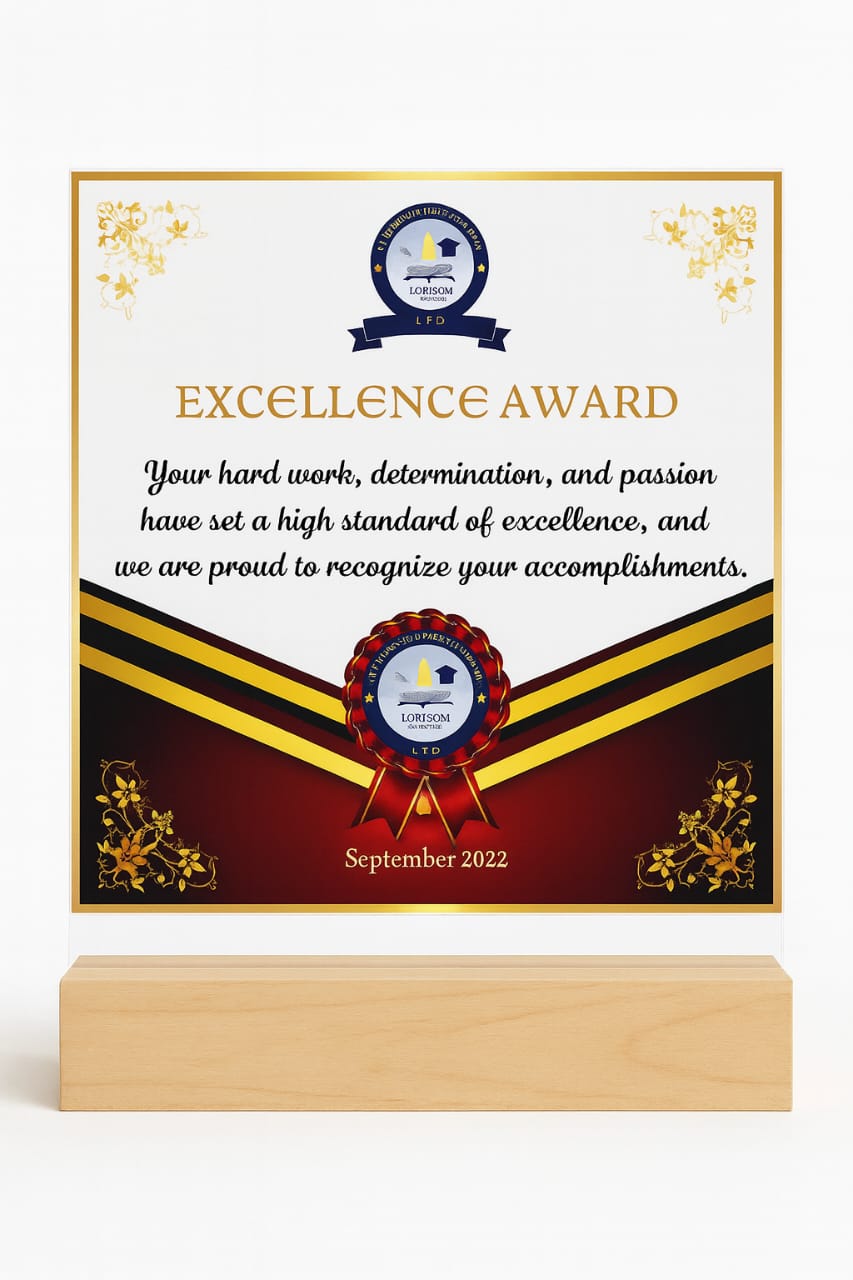 A customizable award plaque designed to celebrate achievement and outstanding performance. It can be personalized with details like name, title, organization, date, and message. Available in A5 and A4 sizes, it features premium materials and a refined finish, making it ideal for corporate, academic, or personal recognition and perfect for display.