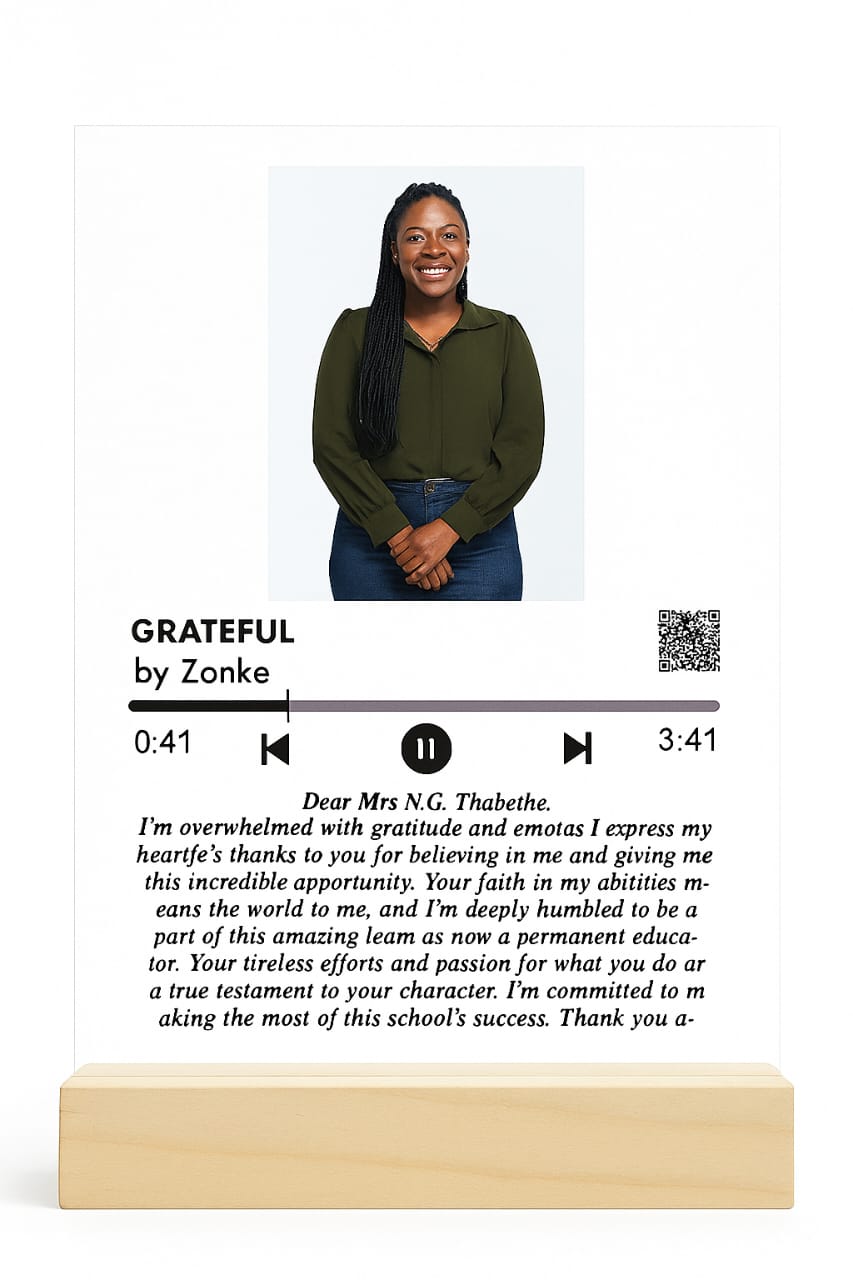 A Personalized 2-in-1 Music Plaque that pairs your favorite song with a heartfelt message, creating a meaningful and elegant keepsake. Available in A5 and A4 sizes, it features a sleek, premium design perfect for gifting or personal display.
